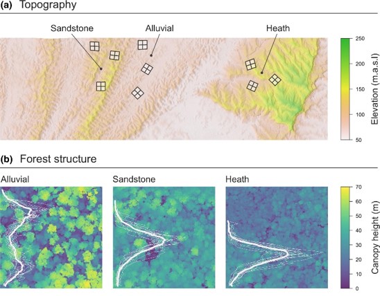 Topography is a key driver of tropical forest structure and composition, as it constrains local nutrient and hydraulic conditions within which trees grow. Yet, we do not fully understand how changes in forest physiognomy driven by topography impact other emergent properties of forests, such as their aboveground carbon density (ACD). Working in Borneo – at a site where 70‐m‐tall forests in alluvial valleys rapidly transition to stunted heath forests on nutrient‐depleted dip slopes – we combined field data with airborne laser scanning and hyperspectral imaging to characterise how topography shapes the vertical structure, wood density, diversity and ACD of nearly 15 km2 of old‐growth forest. We found that subtle differences in elevation – which control soil chemistry and hydrology – profoundly influenced the structure, composition and diversity of the canopy. Capturing these processes was critical to explaining landscape‐scale heterogeneity in ACD, highlighting how emerging remote sensing technologies can provide new insights into long‐standing ecological questions.