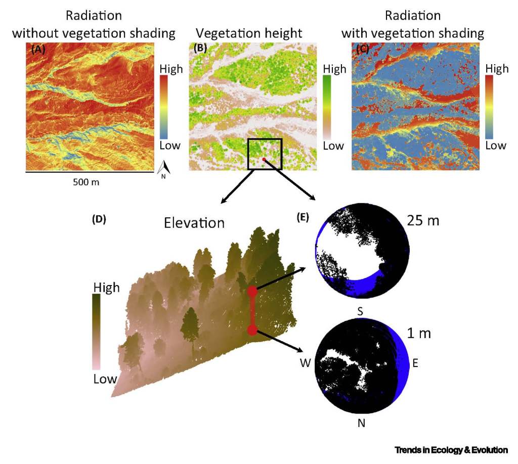 Organisms experience climate at a small scale, where the topography and the vegetation cause microclimates that vary greatly in space and time. The difference in temperature between north and south facing slopes of a mole hill on a hot summer’s day in Europe, for example, is comparable to the temperature difference between the Mediterranean and Scotland. Microclimates are often neglected in ecology and evolution, despite mounting evidence that microclimates matter for ecosystem dynamics and processes, such as the response of organisms to climate change. A key impediment has been the lack of spatial data to map microclimatic variation over large spatial scales and over time. Remote sensing is now offering opportunities to lift this technical barrier, by producing detailed and spatially continuous data-layers that can be used as explanatory variables to model microclimatic conditions over large spatial and temporal scales. We reviewed how these emerging technologies are advancing microclimate modelling and mapping, and highlight some of the opportunities they provide for ecology, conservation and climate change research.