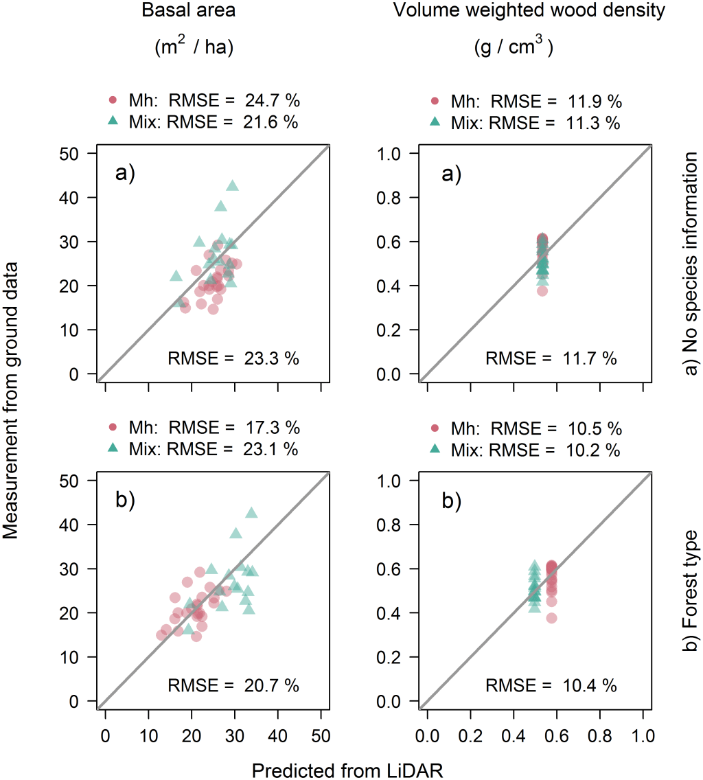 There is currently much interest in developing general approaches for mapping forest aboveground carbon density using structural information contained in airborne LiDAR data. The most widely utilized model in tropical forests assumes that aboveground carbon density is a compound power function of top of canopy height (a metric easily derived from LiDAR), basal area and wood density. Here we derive the model in terms of the geometry of individual tree crowns within forest stands, showing how scaling exponents in the aboveground carbon density model arise from the height−diameter (H−D) and projected crown area−diameter (C−D) allometries of individual trees. We show that a power function relationship emerges when the C−D scaling exponent is close to 2, or when tree diameters follow a Weibull distribution (or other specific distributions) and are invariant across the landscape. In addition, basal area must be closely correlated with canopy height for the approach to work. The efficacy of the model was explored for a managed uneven−aged temperate forest in Ontario, Canada within which stands dominated by sugar maple (Acer saccharum Marsh.) and mixed stands were identified. A much poorer goodness−of−fit was obtained than previously reported for tropical forests (R2 = 0.29 vs. about 0.83). Explanations for the poor predictive power on the model include: (1) basal area was only weakly correlated with top canopy height; (2) tree size distributions varied considerably across the landscape; (3) the allometry exponents are affected by variation in species composition arising from timber management and soil conditions; and (4) the C-D allometric power function was far from 2 (1.28). We conclude that landscape heterogeneity in forest structure and tree allometry reduces the accuracy of general power-function models for predicting aboveground carbon density in managed forests. More studies in different forest types are needed to understand the situations in which power functions of LiDAR height are appropriate for modelling forest carbon stocks.