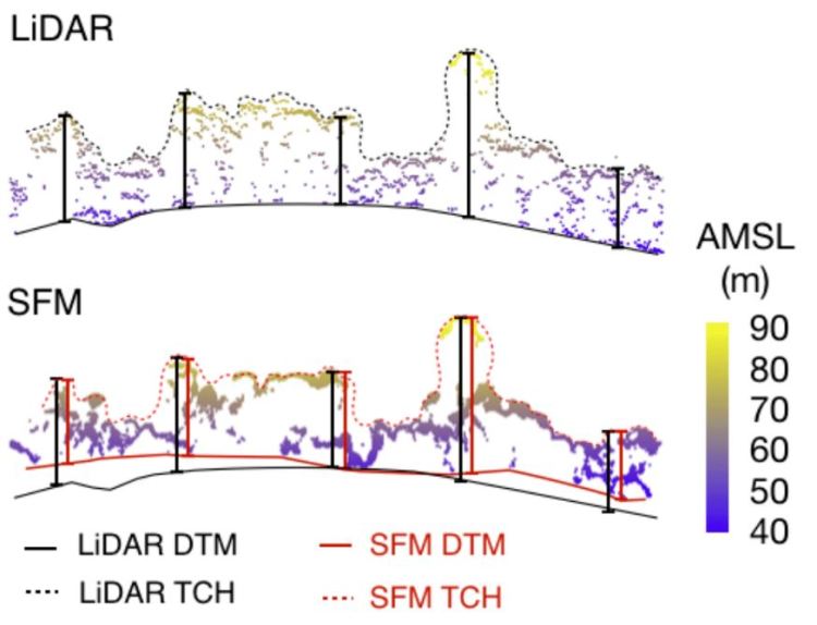 We assessed the quality of these models by mapping logged forest in Indonesia that had already been surveyed by LiDAR and then compared the two approaches. We found a very close relationship between the two sets of tree heights, with 80% of the variation in the LiDAR measurements explained by those from structure from motion but tree heights measured from structure from motion were about 5.5 m shorter than they actually were. This was actually a positive result though because the bias was very consistent making it easy to correct.