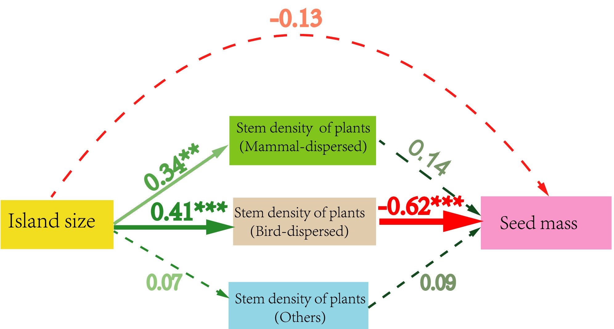 To answer this question, we collected species distribution data of plants, birds, large and small mammals on islands in the Thousand Island Lake, China. We found that both richness and abundance of birds are determined by island size, but not for mammals. Such differential responses of potential seed dispersers led to a higher proportion of seed dispersal of bird-dispersed plants on large islands. Given that birds generally disperse smaller seeds than mammals, large islands may accumulate more small-seeded plants.